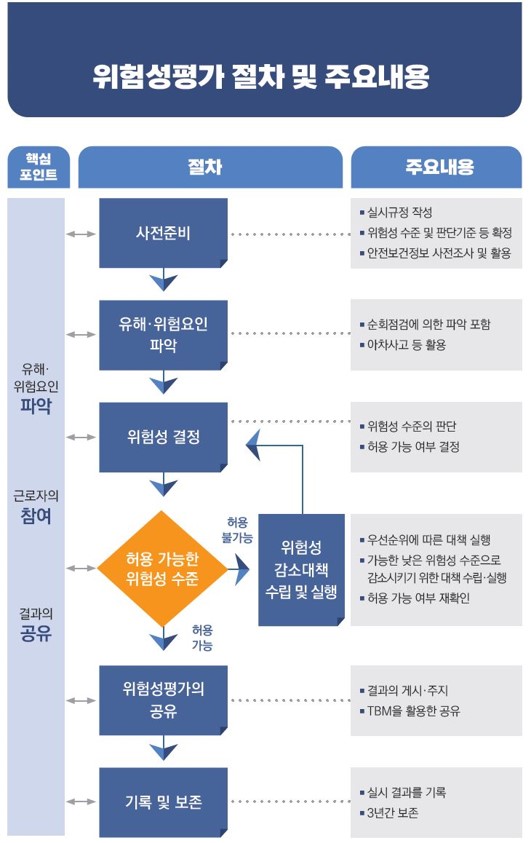 · 유해·위험요인 파악 : 사업장 순회점검, 근로자들의 상시적인 제안 제도, 평상시 아차사고 발굴 등을 통해 사업장 내의 유해·위험요인을 빠짐없이 파악하는 단계입니다.