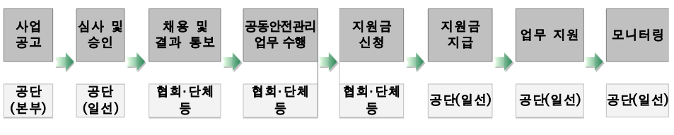 사업 공고 → 심사 및 승인 → 채용 및 결과 통보 → 공동안전관리 업무 수행