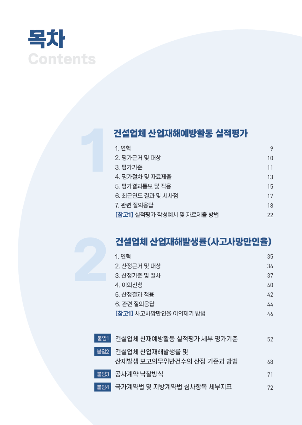 내용 : 건설안전지표(건설업체 산업재해예방활동 실적평가 및 사고사망만인율)에 대한 법규 등 관련 정보