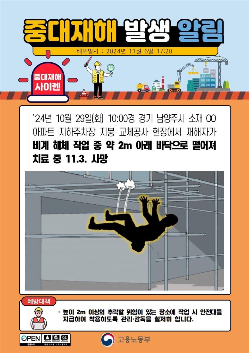10시경 경기 남양주시 소재 아파트 지하주차장 지붕 교체공사 현장에서