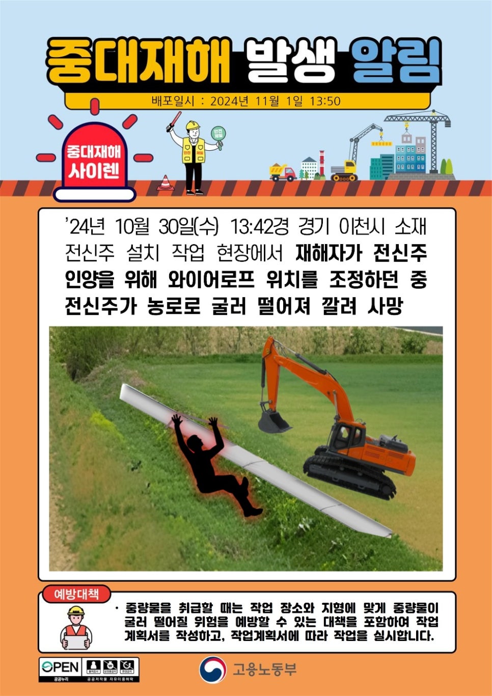 13시 42분경 경기 이천시 소재 전신주 설치 작업 현장에서