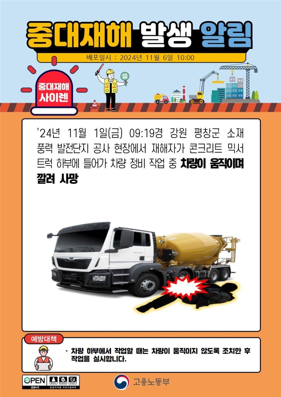 9시 19분경 강원 평창군 소재 풍력 발전단지 공사 현장에서 재해자가 콘크리트 믹서 트럭 하부에 들어가