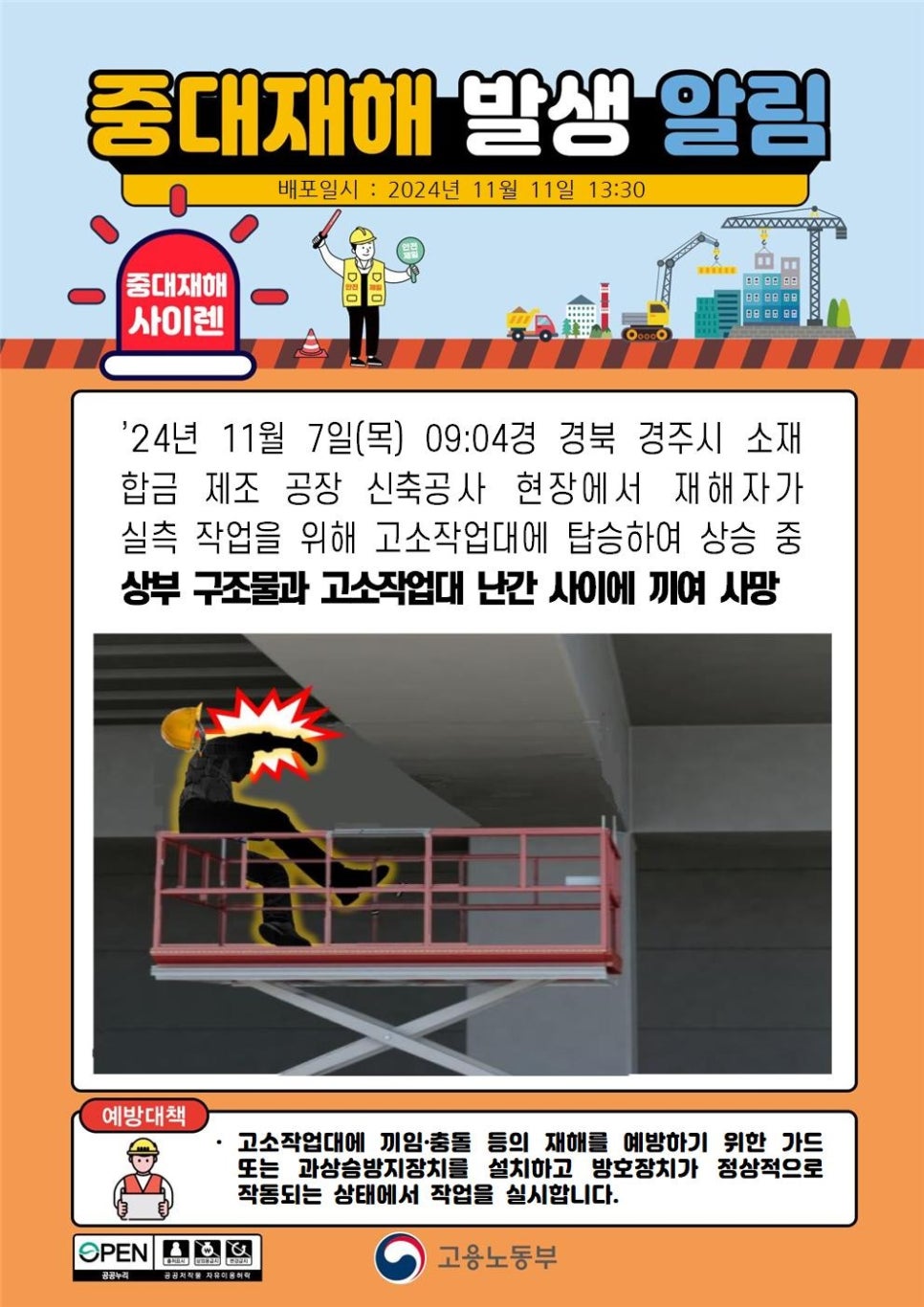 9시 4분경 경북 경주시 소재 합금 제조 공장 신축공사 현장에서 재해자가 실측 작업을 위해 고소작업대에 탑승하여 상승 중