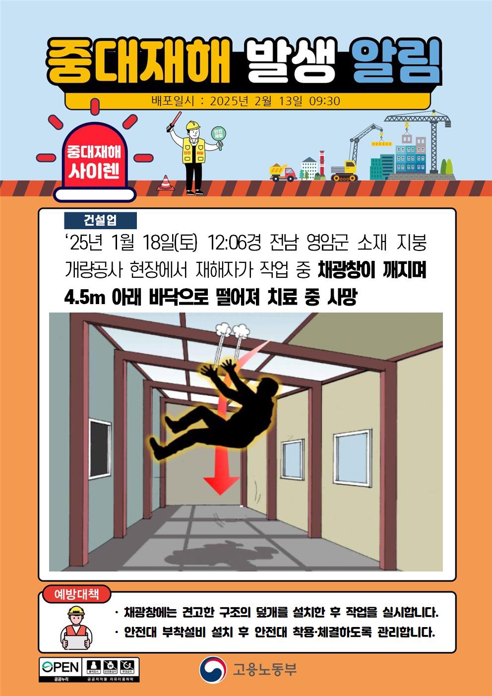채광창이 깨지며 4.5m 아래 바닥으로 떨어져 치료 중 사망