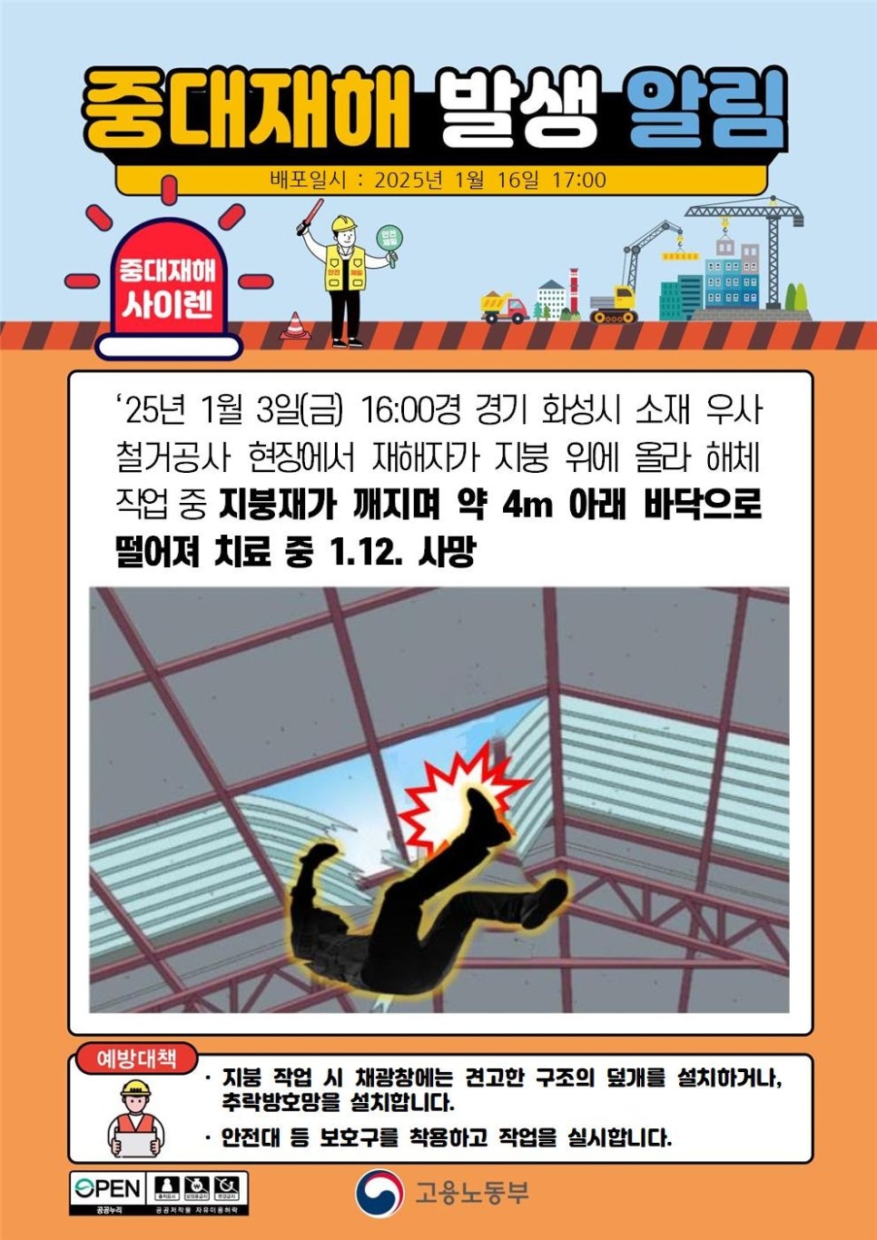 지붕 위에 올라 해체 작업 중 지붕재가 깨지며 약 4m 아래 바닥으로 떨어져 치료 중 1.12. 사망