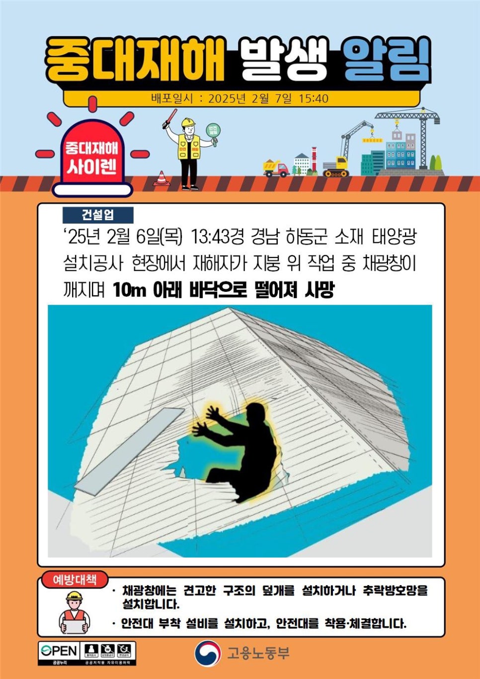13시 43분경 경남 하동군 소재 태양광 설치공사 현장에서 재해자가 지붕 위 작업 중