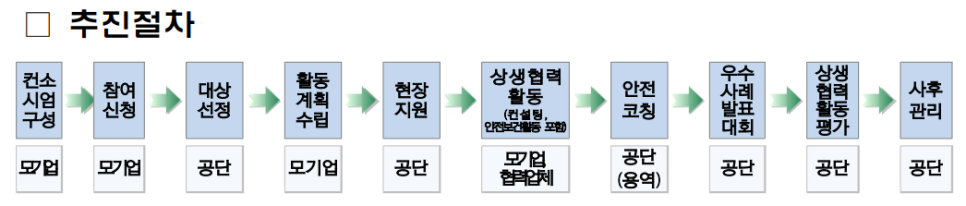 컨소 시엄 구성 ⮕ 참여 신청 ⮕ 대상 선정 ⮕ 활동 계획 수립 ⮕ 현장 지원 ⮕ 상생협력 활동 (컨설팅, 안전보건활동 포함) ⮕ 안전 코칭 ⮕ 우수 사례 발표 대회 상생 ⮕ 협력 활동 평가 ⮕ 사후 관리